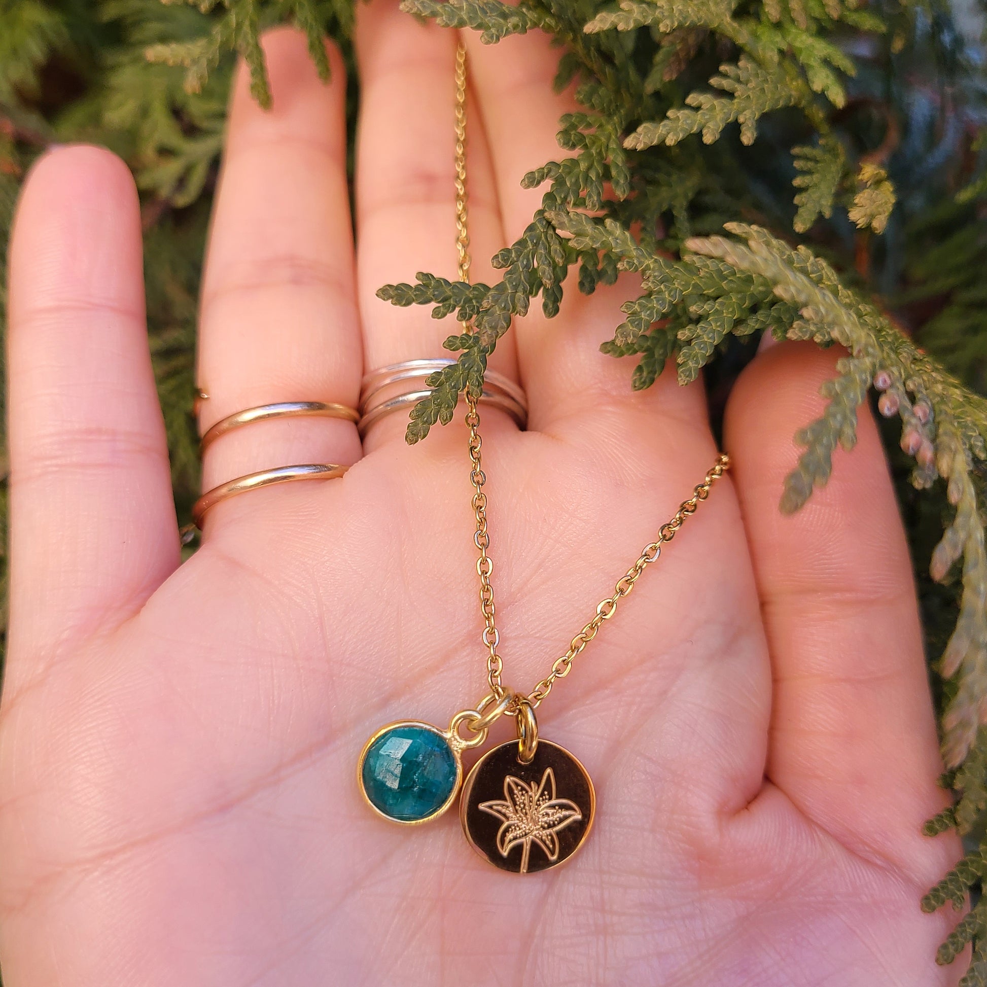 Our May necklace carries the energy of Emerald the Lilly as your birth flower. Emerald had often been considered the “Stone of Love and Good Fortune.” It can promote faithfulness, honesty, integrity, harmony and abundance. Whether your intention is to attract someone with these qualities or to do inner work, Emerald helps you act with a compassionate, open heart. Emerald promotes friendship and unity in all relationships, strengthening bonds that can last a lifetime. The Lilly symbolizes the rejuvenation of the soul. It is often known as the “Flower of Compassion and Sympathy.” Lillies have often been associated with feminine symbolism. Women used to wear lillies in their hair as a promise of an abundant and beautiful life!